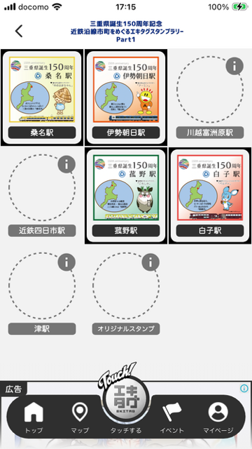 エキタグアプリのイベントの方を確認したら、確かに桑名、白子も、ラリーデザインのスタンプが確認できました。なるほどこうなっていたんですね!分かってなかったです。これなら私も明日、安心してこのラリーの完集を目指したいと思います!